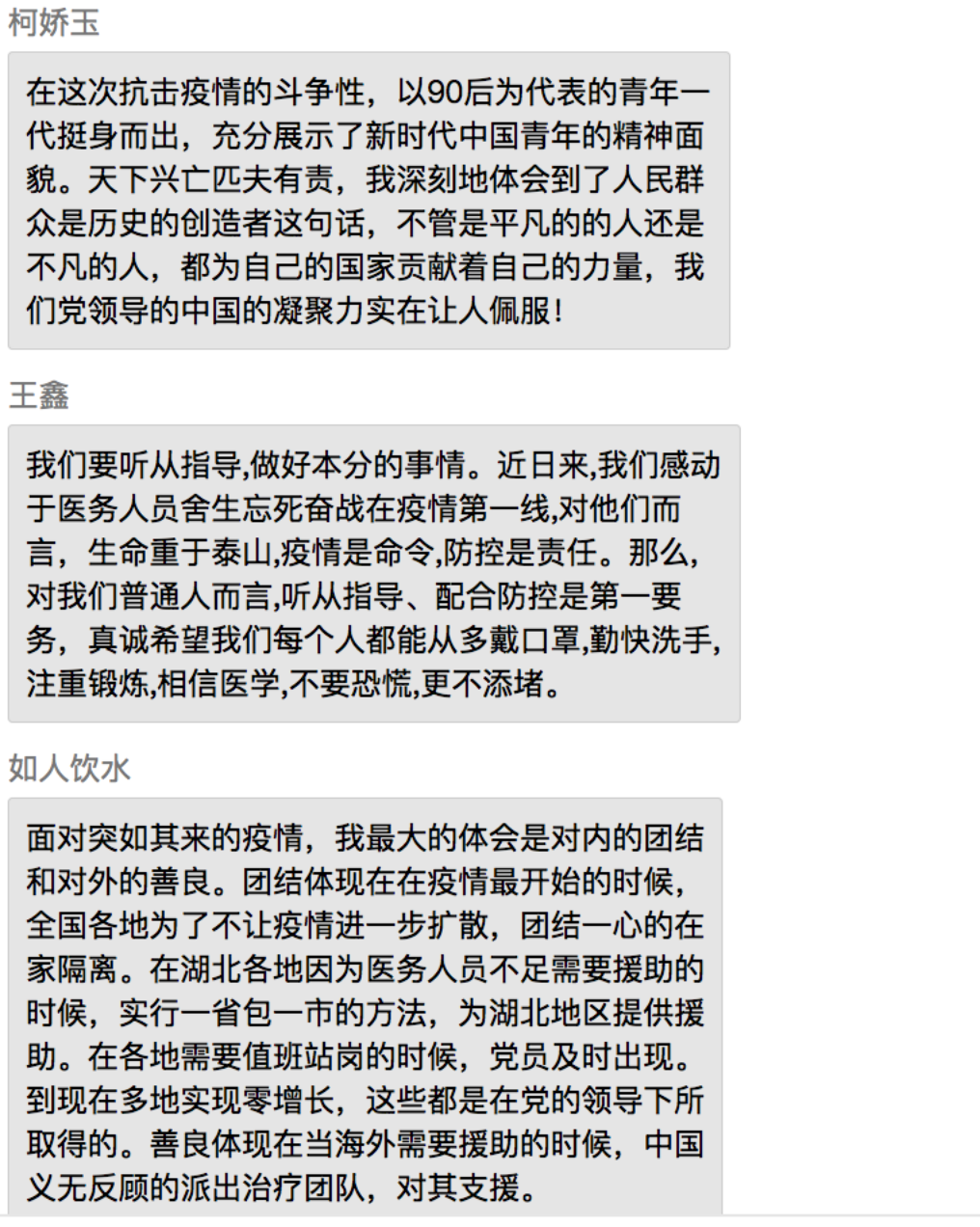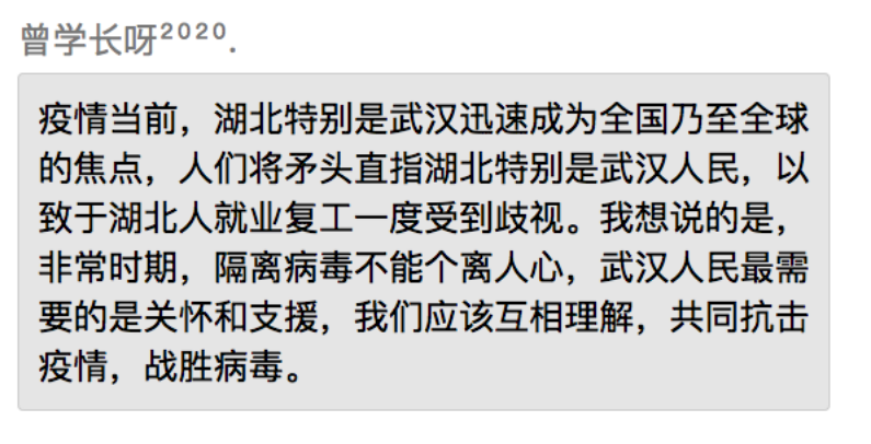 同学们表示,在党中央的坚强领导下,全国上下齐心协力共抗疫情,充分展现了中国特色社会主义制度的强大生命力和显著优越性,再一次见证了气势磅礴的中国力量、万众一心的中国精神和卓有成效的中国速率。作为新时代的中国青年,要勇做走在时代前列的奋进者、开拓者、奉献者,并积极配合政府、新葡京