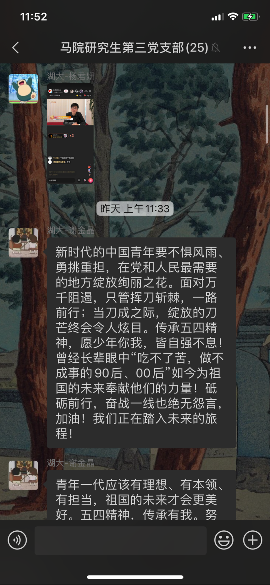 研究生第三党支部组织观看由共青团中央举办的“让青春为祖国绽放”网上主题团日活动。在观看直播的过程中,支部党员真学习视频所讲内容,对五四精神有了更深层次的感悟。