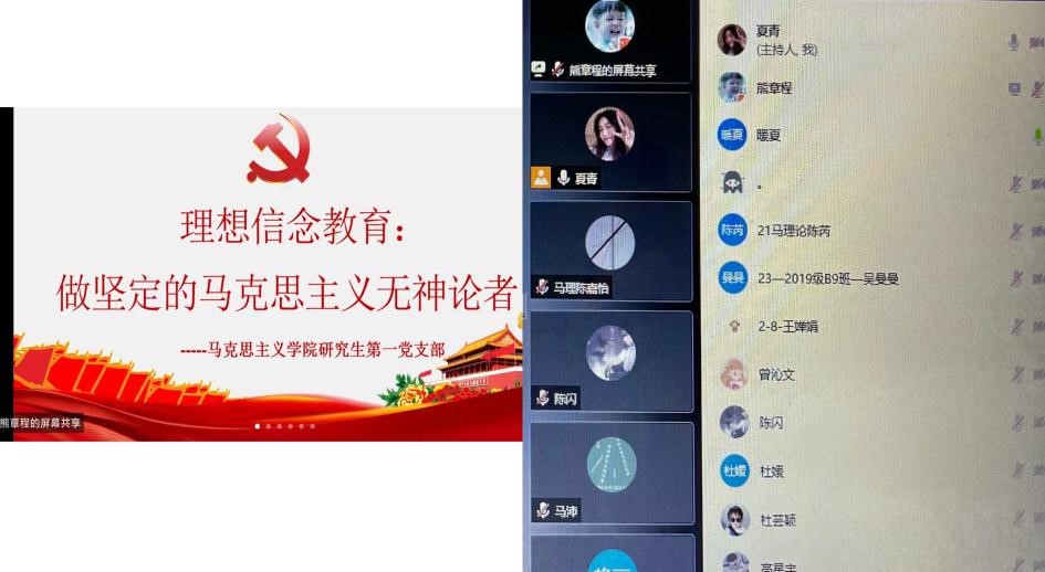 研究生第一党支部利用腾讯会议在线上召开以“做坚定的马克思主义无神论者”为主题的三月份主题党日活动暨2021年度组织生活会、民主评议会。支部书记夏青主持会议。
