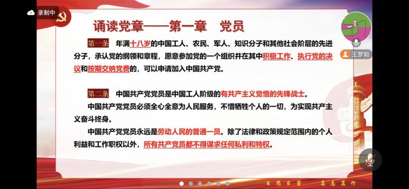 会议伊始,全体同志学习了党章第一章——党员的内容,宋佳雪同志、徐薇同志和顾晓宇同志分别为与会成员诵读党章。经过对本部分党章的学习,同志们认识到了中国共产党党员是中国工人阶级的有共产主义觉悟的先锋战士,共产党员享有“参加党的有关会议,阅读党的有关文件,接受党的教育和培训”等8项权利。