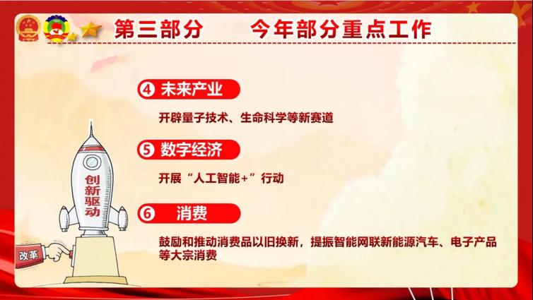 随后,主持人分三个方面,对政府工作报告作了相关介绍。一是回顾2023年工作,如经济总体回升向好、粮食产量创历史新高等;二是介绍2024年主要预期目标,如GDP增长5%左右,城镇新增就业1200万人以上等;三是阐述今年部分重点工作,如超长期特别国债的发行、未来产业和数字经济的发展等。