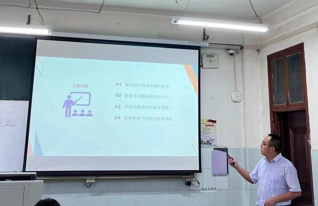 陈杰老师从“新课标对高考命题的要求”“新高考试题命题特点分析”“思政试题命制的基本策略”“素养导向下的思政教学策略”四个方面展开讲座。他详细讲解了武汉市命题的具体要求,并对在场同学提出建议,新教师应该多研究题目,学习自己命题,勤做题,多分析,不断提升教师专业素养。