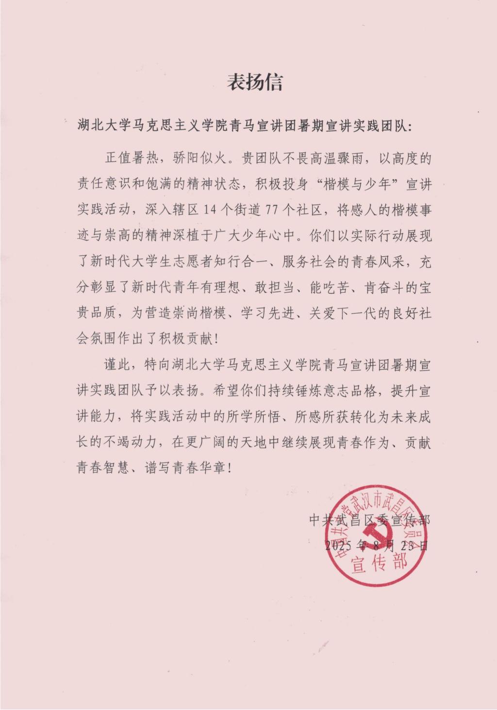 (通讯员 文/何舒鑫)近日,新葡京 青马宣讲团收到中共武昌区委宣传部发来的表彰信,对其在武昌区“楷模与少年”宣讲实践活动中的表现和成效予以高度肯定。