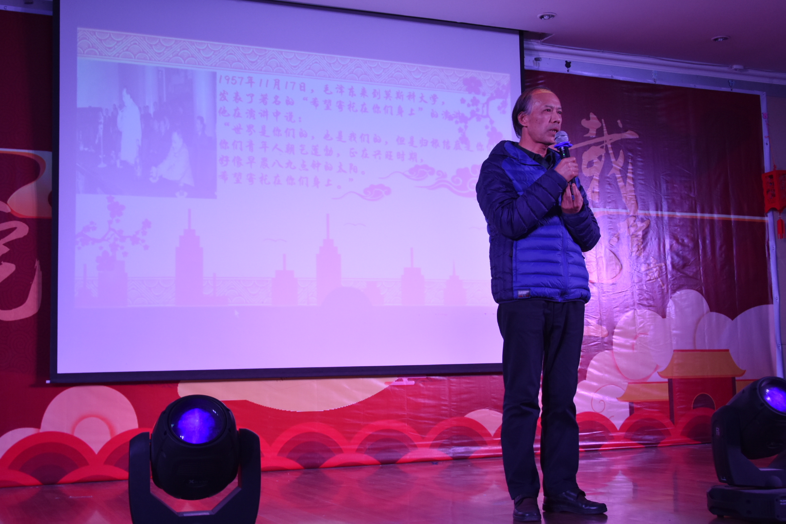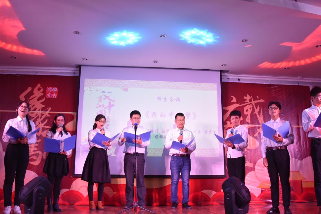的元旦晚会一直秉持着“马院一家人”的理念,真正做到了师生大联欢,老师们也为大家带来了很多精彩的节目。郭劲松老师作为神秘嘉宾上台献唱了《贝尔加湖畔》,唱歌之前他还笑着说:“每年都请我来当神秘嘉宾,我都神秘好几年了。”汤书记也为同学们带来了一首《等你等了这么久》,并说:“不管多少年,你们以后在哪里,我都在马院等你们。”被大家亲切的称为“贺爷爷”的贺祥林老师用湖南话模仿了毛主席的演讲“希望寄托在你们身上”,并为大家献唱了几句,向同学们表达了自己的殷切期望。一首慷慨激昂的师生合诵《我的中国梦》点燃的观众们心中浓浓的爱国之情。最后,晚会在马院硕士研究生以及郭劲松老师合唱的《难忘今宵》中落下帷幕。