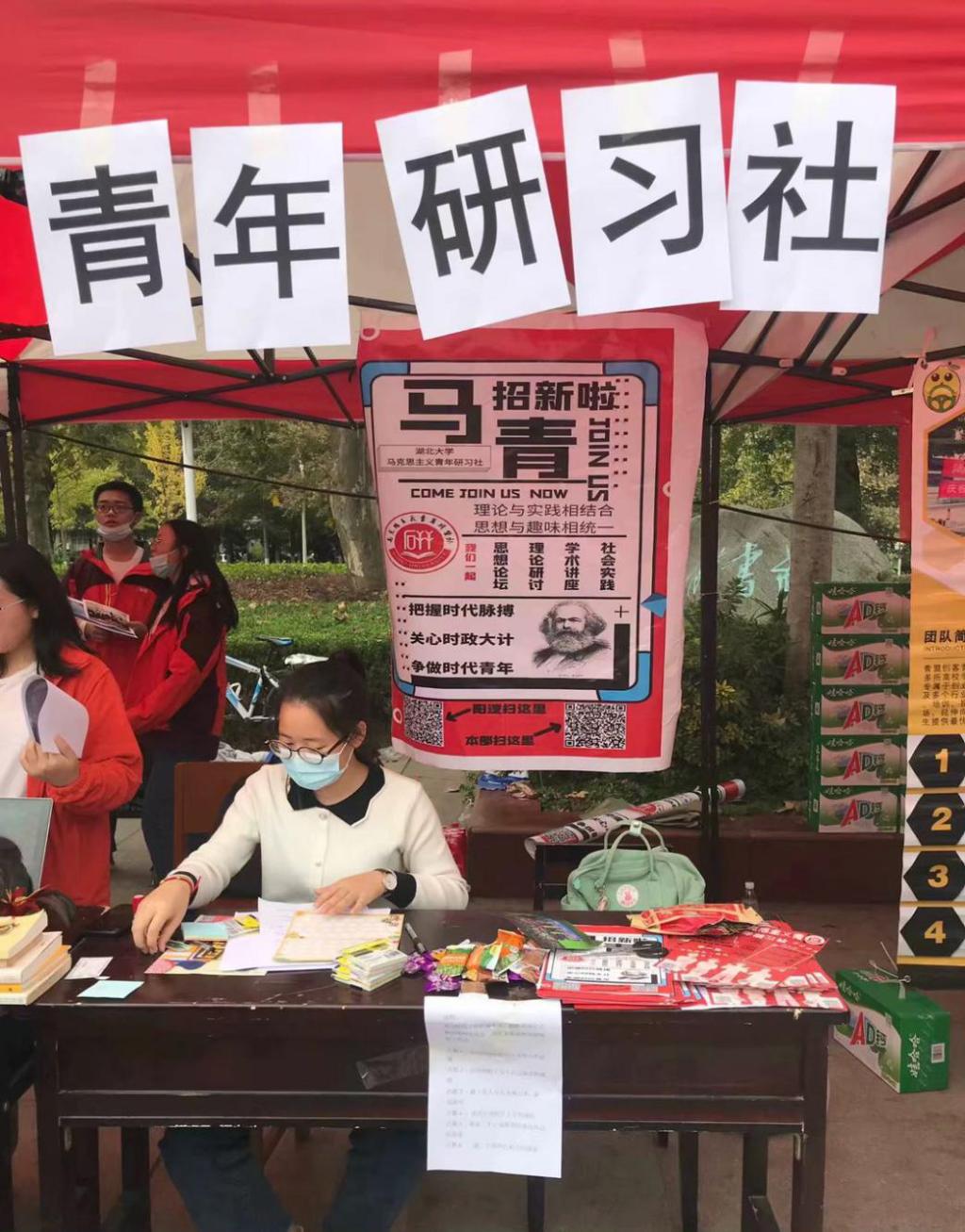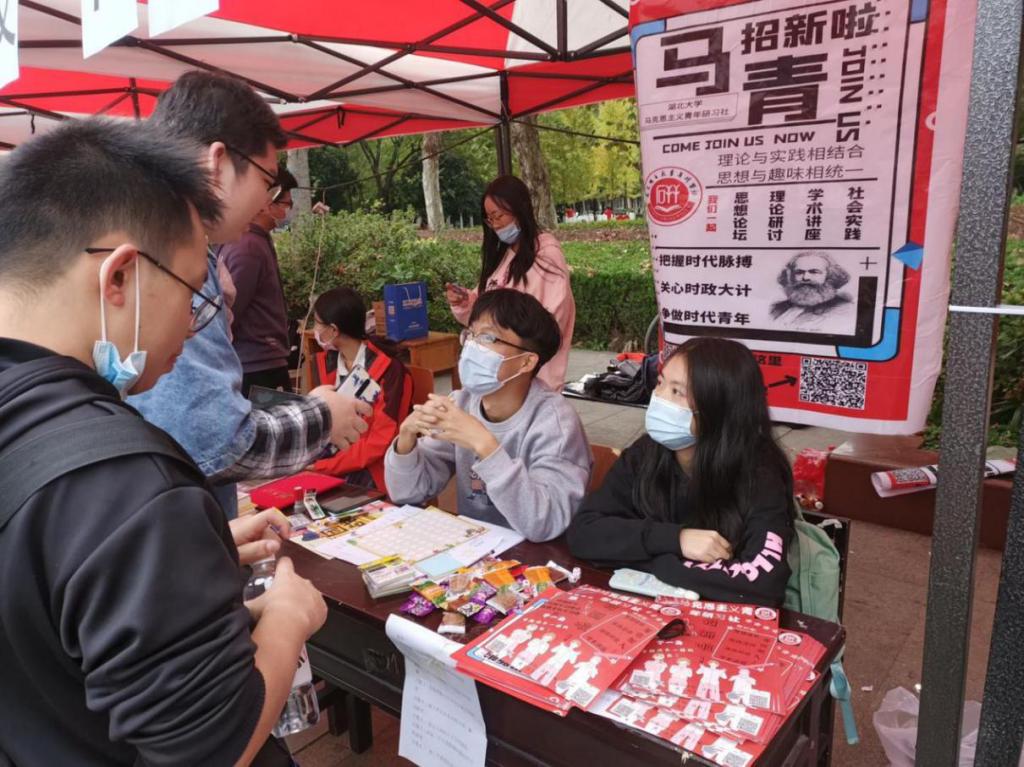 在招新现场,各个社团都使出浑身解数,我们马克思主义青年研习社也不例外。精美的海报和有趣的小游戏吸引了许多同学前来了解马克思主义青年研习社。我们青年研习社的值班成员耐心地解答前来咨询的同学们的提问,逐一向他们介绍社团活动,部门职能等相关信息,并引导感兴趣的同学报名入社。