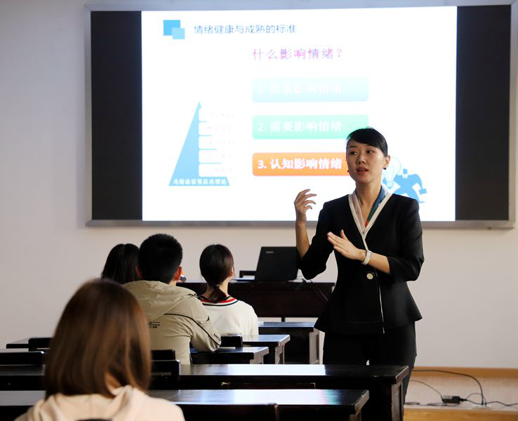 就“为什么有情绪”的问题,通过分析人的喜怒哀乐等情绪,占婧老师指出,情绪是人对环境的一种反应,有情绪是人的本能,情绪本身没有好坏之分,但必须要懂得适时适度地加以疏导。在“情商EQ与人生”方面,占老师结合事例指出,高智商并不意味着高情商,情商主要体现在自我认知能力(自我觉察)、自我控制能力(情绪控制)、自我激励能力(自我发展)、认知他人能力(同理心)和人际关系管理能力(领导与影响力)五个方面,高情商需要培育和控制好自己的衍生情绪。占老师从“什么影响情绪”、“情绪的分类”、“情绪理解与表达”和 “情绪健康的表现”四个方面阐述了“情绪健康与成熟的标准”。占老师指出,影响人情绪的因素有情景、需要和认知三种,其中认知是最高级别的因素;情绪有七情之分、基本情绪(如恐惧、焦虑、满足等)和社会情绪(如善恶感、荣辱感和内疚感等)以及正性情绪和负性情绪三类;要觉察自己真正的感受,选择适当的时机,正确、清楚、具体地表达自己的情绪;保持乐观的心态、接纳自己的情绪、善于调整自己的不良心态、宽容别人增加愉快体验和掌握有效的情绪调节方法是情绪健康的具体体现。占老师通过《头脑特工队》的视频,介绍了情绪反应过度、情绪反应不足、负情绪泛化或持续时间过长、不能接受或无法控制情绪所造成的情绪困扰,以及波动性和两极性、冲动性和爆发性、矛盾性和复杂性、内隐与掩饰性、想象性等情绪特点。占老师最后还指出了“管理情绪,提高情商”的方法。她强调,情绪能够进行管理,且具有很高的自主性,需要通过有效的方法达到修己安人的目的;可以通过心理暗示法、注意力转移法、自我安慰法、交往调节法和情绪升华法改变非理性观念,进行自我情绪管理;而对于衍生情绪,则需要训练自我关注的能力,不加评判地观察自己,学会平衡思考和处理情绪危机。