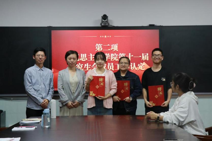 党委副书记晏妮老师、研究生辅导员冷自衍为第十一届研会成员颁发工作认定并合影留念。