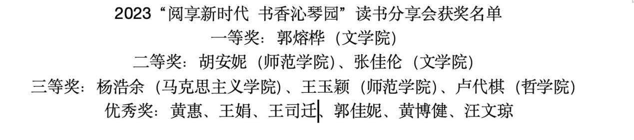 最后,经过现场评委老师的专业评审,郭熔烨同学获一等奖,胡安妮等2名同学获二等奖,杨浩余等3名同学获三等奖,黄惠等6名同学获优秀奖。本次读书分享会既开阔了同学们的视野,又培养了“爱读书、善读书、好读书”的良好氛围,有力推进了新葡京