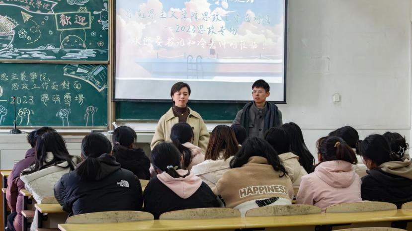 党委副书记晏妮和辅导员冷自衍来到阳逻校区开展“思政工作面对面”主题活动,与2023级思政专业(师范类)的同学们开展交流。活动中,同学们就专业学习、校园生活、未来规划等方面与老师们进行了热切的讨论。