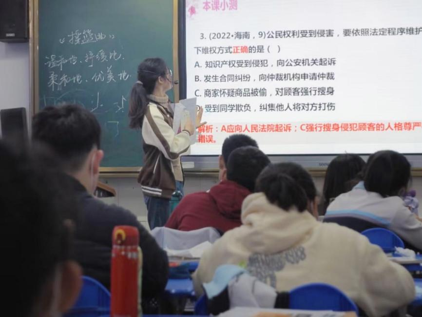 实习生徐珂谈道:“不知不觉,我们已经在四十九中实习了近一个月了,从二月初懵懵懂懂地听课学习,到三月始走上讲台,才发现给学生上课并没有想象中的那么困难,也逐渐学会享受成为一名老师的乐趣。初一的学生虽偶有顽皮,但他们身上也有着这个年龄段该有的活力,课堂上他们积极互动回答问题,这样的互动性是在大学课堂上做展示无法体会到的,也鼓励了我静下心来上好每一堂课的决心。这次实习最大的感想应该是我能克服自己对初中讲台的恐惧,能够慢慢探索进步讲好一节政治课。”