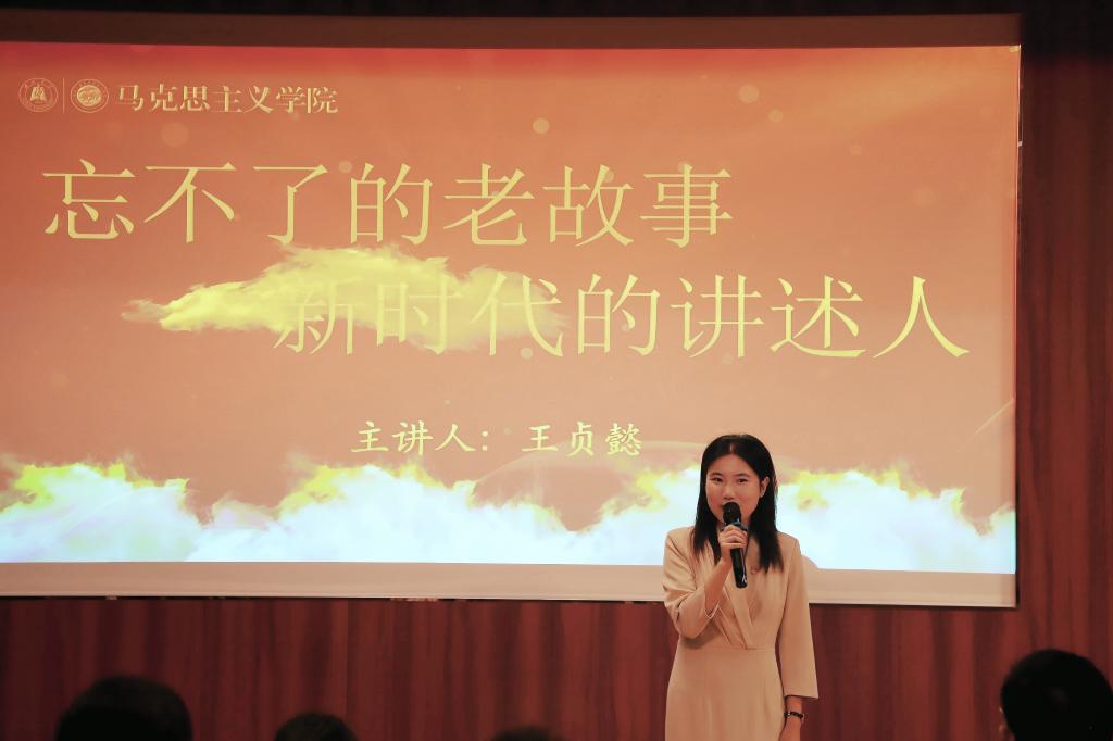 2023级马克思主义理论专业硕士研究生王贞懿主讲。她以“忘不了的老故事,新时代的讲述人”为题,深情地讲述了她与“红巷青马”结缘的历程。借助黑白光影中的老照片、党员爷爷铿锵有力的言辞、尘封在儿时记忆中的信仰萌芽等素材,王贞懿娓娓道来共产主义信仰的代际传承与红色血脉的赓续。她一边回顾过去,一边展望未来,激励广大青年传承红色基因,勇担时代重任。