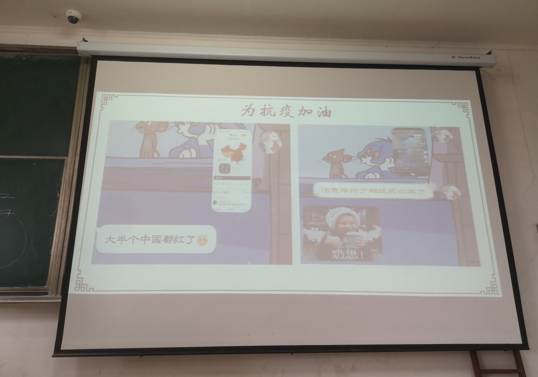 刘欣悦、刘兆雯等五位同学主动上台,面向全班同学,或讲述自己亲身经历、耳濡目染的抗疫故事,或上升至理论高度,谈起自己对国家政策和党的领导的深刻感悟。分享展示内容丰富、角度多样,对自己、对同学都是一场无形的抗疫精神教育、思想政治教育。