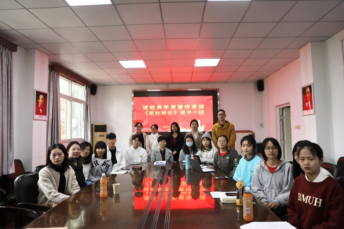 本次读书会以《反杜林论》为研读文本,分为学生分享、导师点评和自由交流三个环节。2019级4名博士生分别就《反杜林论》的历史背景、主要内容以及当代价值等方面进行分享,并论述了自己在研读中的心得体会。