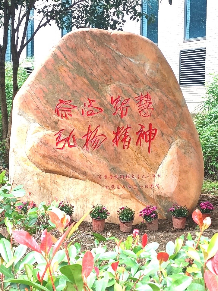 校园,大家在集体捐赠的“崇尚智慧、弘扬精神”的景观石前合影留念。