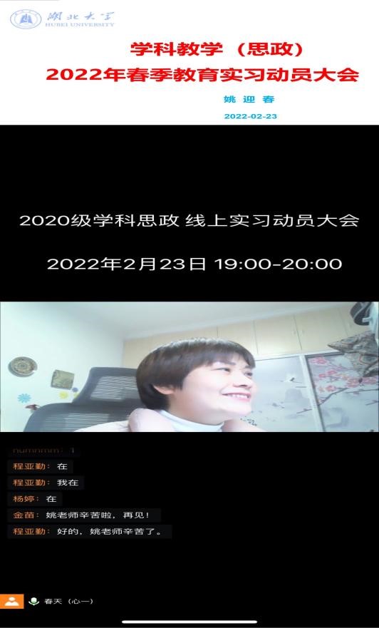 召开了2020级学科教学(思政)专业线上实习动员大会。会议由学科负责人姚迎春主持,校内指导老师杨婷、程亚勤以及2020级学科(思政)专业全体同学参加。