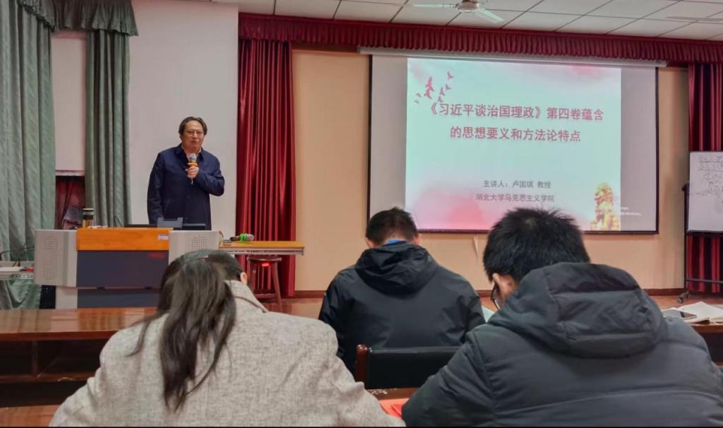 卢国琪教授从思想要义和方法论两个方面展开,深入系统地讲解了习近平新时代中国特色社会主义思想的核心要义,并通过结合实例,生动全面地展现了习近平总书记作为马克思主义政治家思想家战略家的深刻洞察力、敏锐判断力和理论创造力,重点梳理了《习近平谈治国理政》第四卷中所蕴含的战略布局的方法、统筹兼顾的方法、聚焦问题的方法、守住底线的方法和善于总结的方法。卢国琪教授在宣讲中既注重理论性和严肃性,又有不失生动活泼的旁征博引,言之有物论之有据,对《习近平谈治国理政》第四卷的思想要义和方法论在新葡京