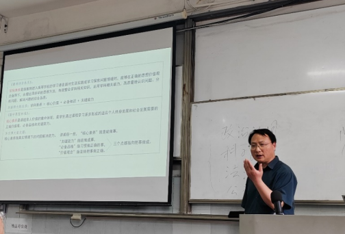 金本德老师的讲座主题为“高中思政课学科核心素养的涵义与培育”,他结合自身丰富的教学与研究经验,从高考考试内容改革进展及成效、“一核四层四翼”高考评价体系、高中政治学科核心素养深度剖析、核心素养导向下的课堂教学等方面展开论述。金老师指出,要领会核心素养的精神实质,将学科核心素养具体化,服务自己的教学。本次讲座气氛活跃,在互动环节,金老师以“郑州中院关于田某某诉杨某生命权纠纷”为例,现场传授将社会热点案例融入高中思政课教学的原则与方法。他强调,在选择性必修二《法律与生活》教学中,要坚持法、理、情的统一,渗透“理情”教育。作为一名思政课教师,要树立“大思政课”意识,有针对性开展学科实践课,拓宽高中思政课教学边界。