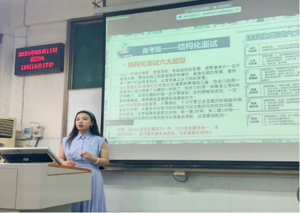 5月11日下午,郭翰林同学为同学们讲述了自己上岸洪山区教育局高中思想政治教师的故事,从备考准备、考试流程、当前工作心得几方面,鼓励同学们要树立信心,深耕专业知识。同时要善于反思,善用巧思,“讲好、讲活、讲深”高中思政课。