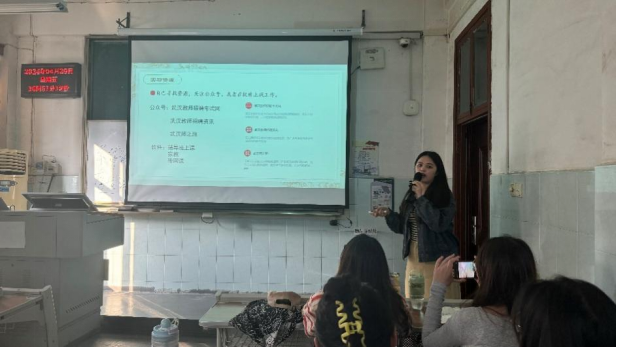 专项招聘相关事宜,从自身备考历程、初试面试流程、及上岸后的准备等几方面为同学们作出详细分享。王潇向大家分享了诸多有关武汉市教师招聘的有关信息与资料,并提醒同学们一定要善于寻找就业信息,妥善安排学业与工作。