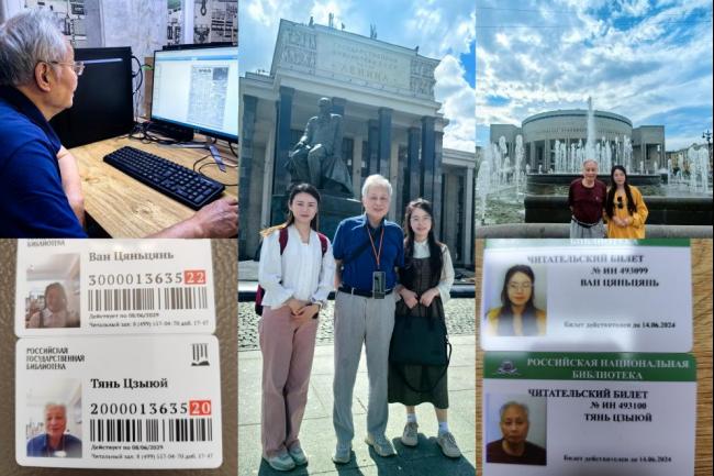 (图为团队成员在俄罗斯国家图书馆和列宁图书馆查阅资料照片)
