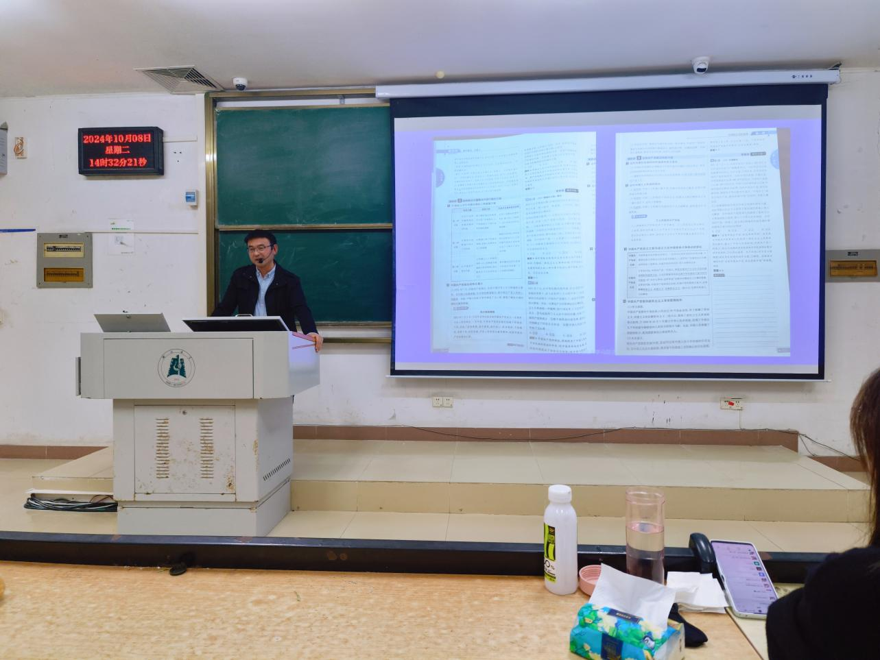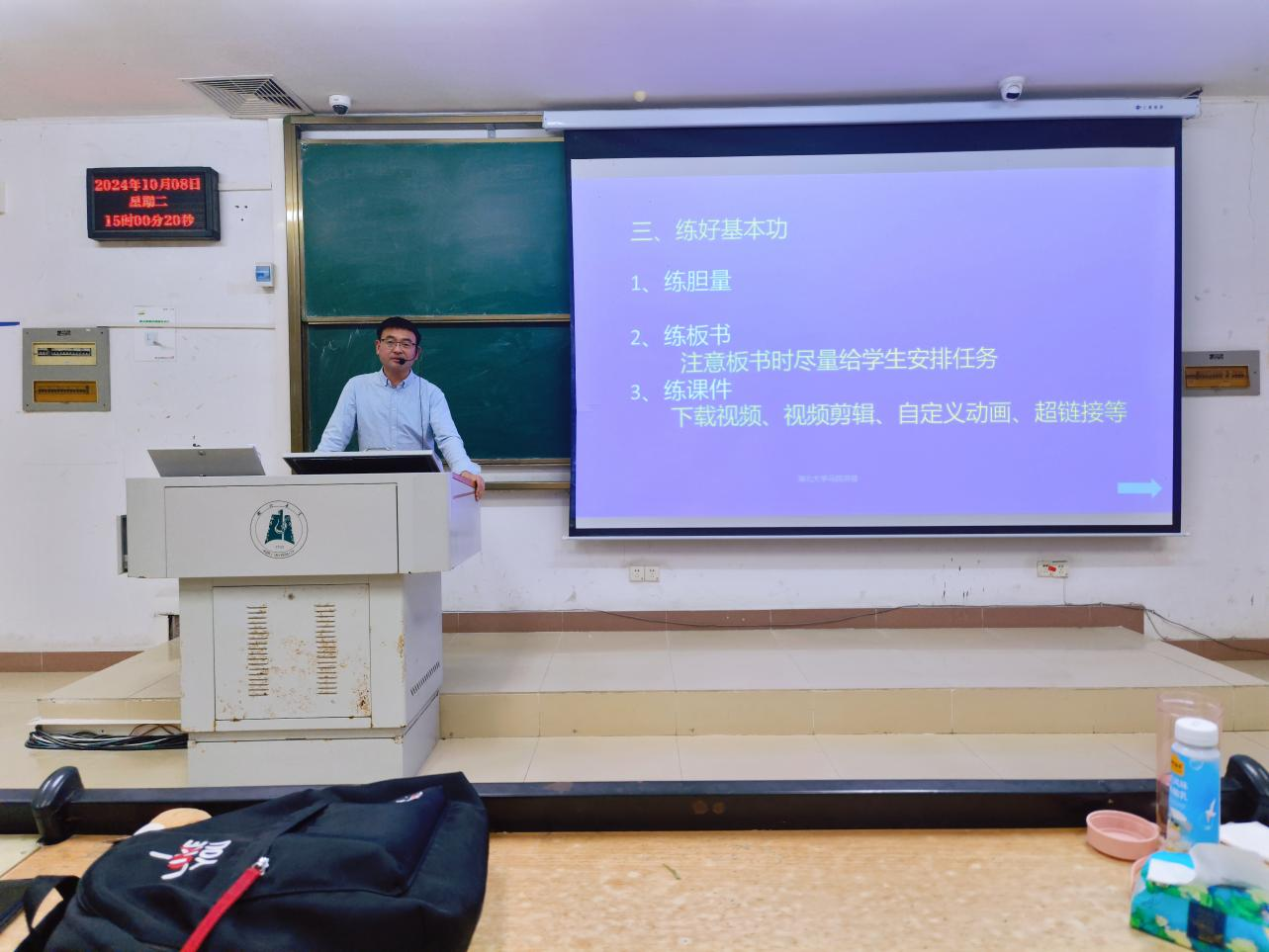 周爱民老师强调了练好胆量、板书、课件三项教师基本功的重要性,并分享了在板书时给学生安排任务,合理设置课件超链接等实践措施。周爱民老师还提出,同学们要多做大型考试题目分析考点变化,将教材知识点先按重要程度分类,而后有选择性地授课;并提醒同学们开展议题式教学时,要重视学生的自主性,提高教学效果。