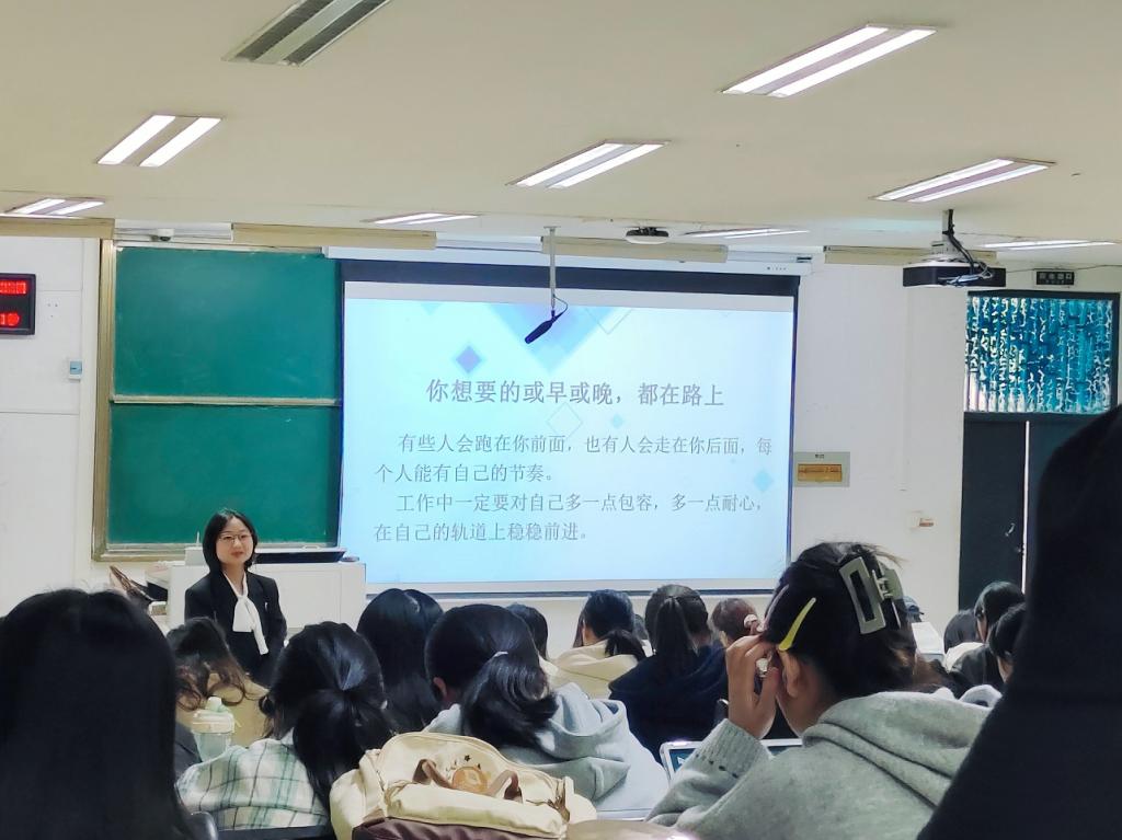学历只是敲门砖,工作能力才是立身之本。杨倩老师鼓励同学们做一个“多面手”,探索培养自身多元能力以保持对岗位的热爱。杨老师结合自身外出学习经历提醒同学们不放弃任何一个学习机会,向网络学习、向优秀教师学习。
