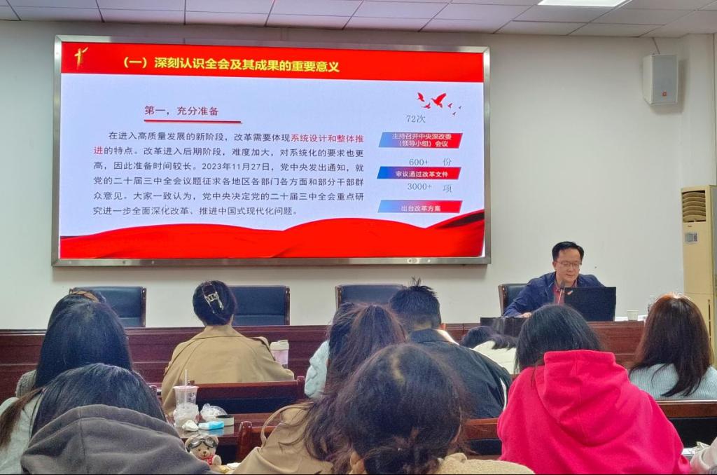 在课堂上,熊友华院长围绕全面深化改革取得的重大成就、进一步全面深化改革的重大举措及其实践路径三大核心议题展开。他详细分析了全面深化改革对于推动中国特色社会主义事业发展的重要意义,深入解读了进一步全面深化改革的重大举措,特别强调了改革的系统性、整体性和协同性。同时,熊院长还鼓励同学们将学习成果运用到实际工作和研究中去,以实际行动践行会议精神,积极投身于国家建设和社会发展中去。